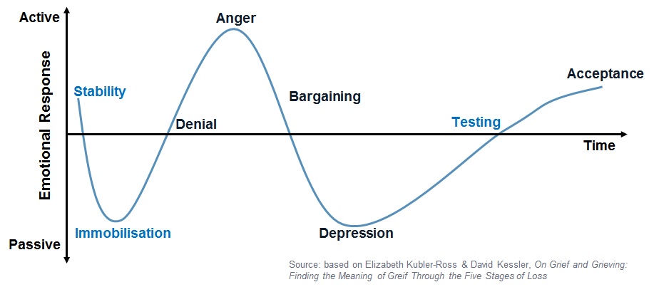 Immobilisation and denial are where people are caught in the headlights and freeze. Performance dips sharply and people say things like, ‘Everything was ok as it was – why do we need to change?’