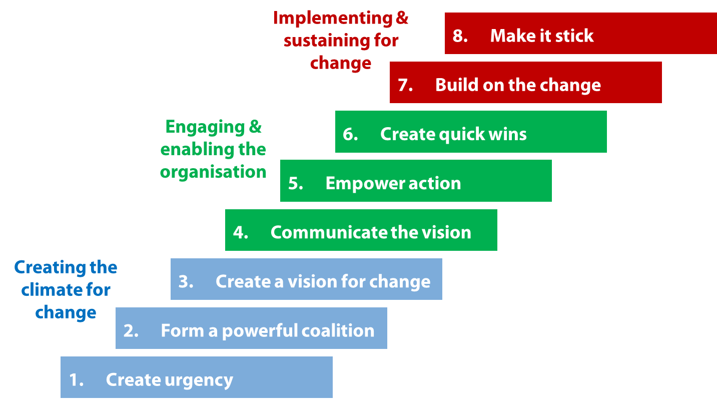 John Kotter is a professor at Harvard whose career has been built on researching organisational change. His 8-step programme has been used successfully by all sorts of companies around the world and you could use it too with your company. I’ve summarised the programme but you could read more in his book called ‘The Heart of Change’.